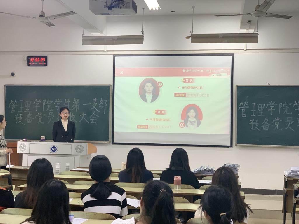 2022年11月21日12:20管理学院学生第一党支部在教学楼B204召开支部大会,讨论是否接收万裕玲等6名同志为中共预备党员的相关事宜,会议由支部书记李林主持,支部全体正式党员、预备党员及拟接收预备党员共28人参与了本次会议,会议严格按照组织发展程序进行。
