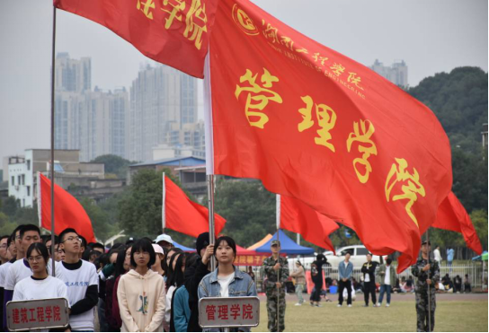 2020年11月5日,湖南工程学院秋季运动会在主校区田径场如期举行,赛场艳阳高照,管理学院方阵的同学们昂首挺胸,朝气蓬勃地向主席台走来,舞着三色的扇子,整齐划一。跳着青春的舞蹈,散着肆意的光芒。“管理英才,继往开来,管院雄风,谁与争锋”的口号回荡在赛场的上空。开幕式后,运动会正式开始。