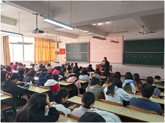 本月讲评主要内容如下:第一 : 公布管理学院十月份常规工作考核排名情况。第二:近期工作汇报:1.完成了管理学院国家奖学金和国家助学金评定领导和工作小组长会议。2.校运会工作:在老师同学们的认真组织配合和积极热情参与下,运动会顺利进行并且我院取得了骄人的成绩。3.课外科技文学活动工作:①老师同学们都在积极参加筹备"挑战杯"比赛项目。②完成了喜迎19大征文比赛和演讲比赛并公布我院获奖名单。4.常规工作通报:完成到课率情况、晚归情况、优寝、不合格寝室、教室卫生情况、班级考核情况的通报。第三:团学工作:寒假期间请每位同学进行社会实践活动,要求和专业实习鉴定,盖章,签字,写实习报告,并进行评分。2.青马工程网络培训,请大家按时学习,按照规定学习,记得上传学习心得。 3.学校即将开展学代会。第四:安全卫生教育:1.提醒同学们防骗。2.提醒同学们禁止在宿舍使用明火、大功率电器,预防火灾隐患。3.提醒同学们防病。4.教室寝室卫生教育:①全体同学务必将垃圾带出宿舍楼,放入外面的垃圾桶中,保持宿舍干净整洁。②各班同学务必保持上课的教室干净整洁。