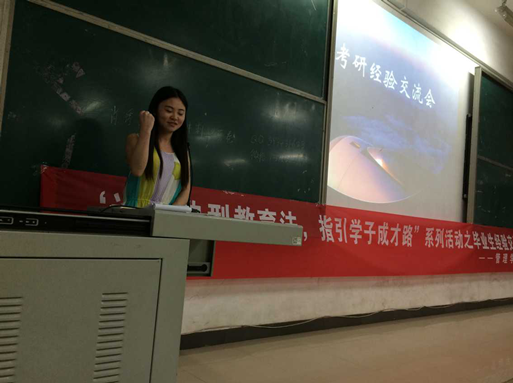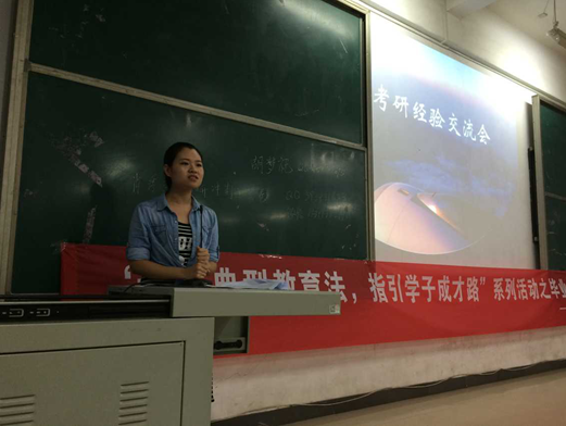 “运用典型教育法,指引学子成才路”系列活动之毕业经验交流会于6月3日晚在新校区D101拉开序幕。本次交流会特邀我院学办主任罗荃老师出席, 2015届考上研究生的学姐们为在校学子们带来了一场别开生面的交流会。