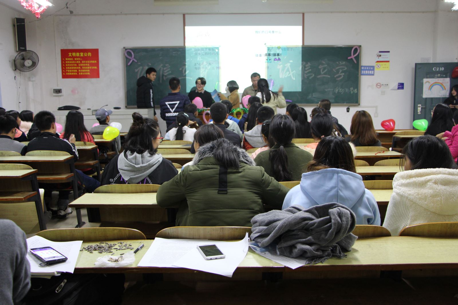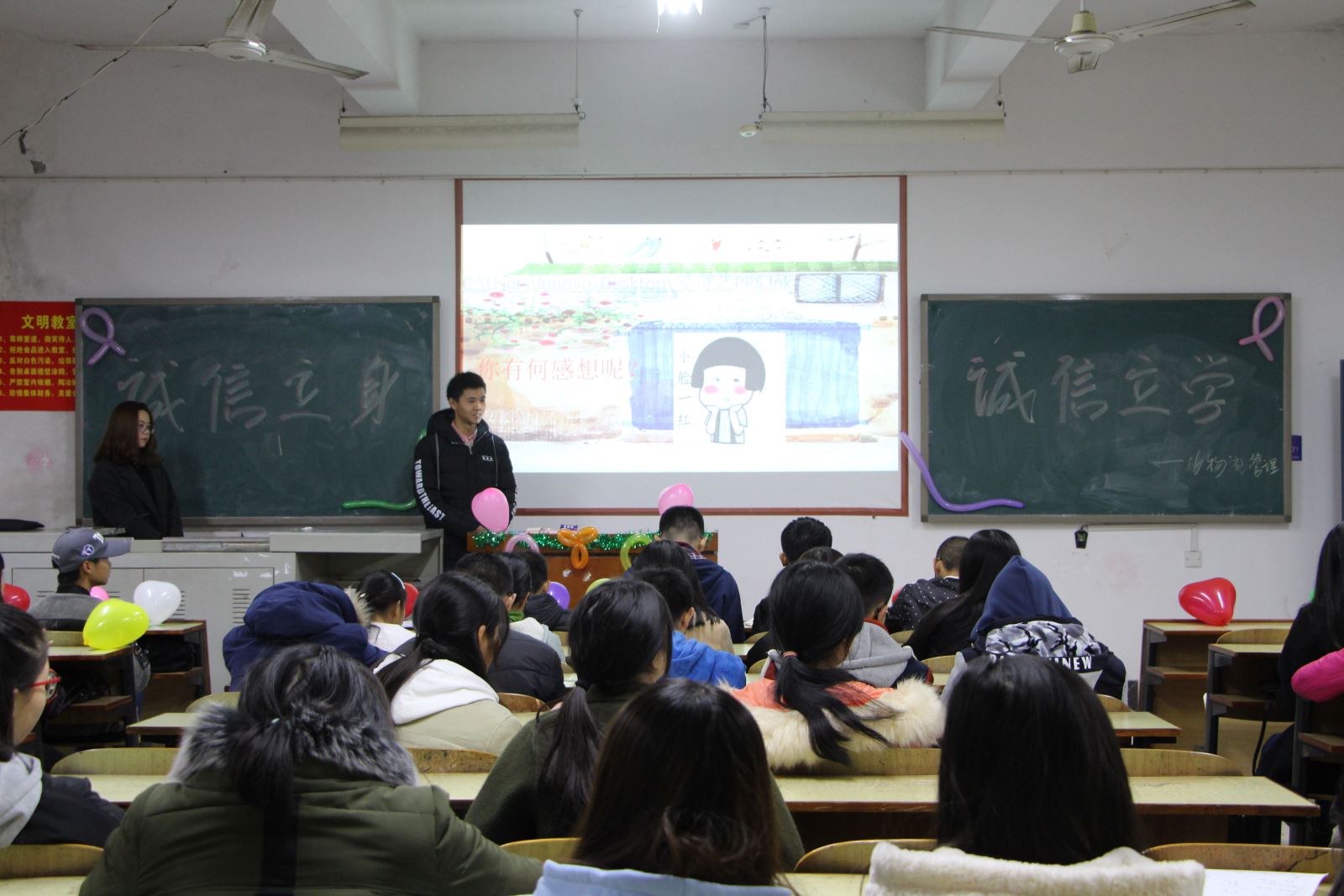 阳光正好,湖南工程学院学院管理学院各专业班级于2017年11月28日晚上7点举办了主题为“诚信立身,诚信立学”的班会,班会主要由班委负责,全体同学参加。