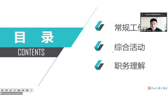 12月19日下午14时,为总结本学期学生会的各项工作成果,加强对学生会工作人员的管理,进一步制定来期工作方针,为来期的学生会工作做铺垫。管理学院在线上召开学生会工作人员述职评议会议,团总支书记彭小玲、学生联合组织主席团、部长团全体人员参加了本次会议,会议由易班管理中心主任段妙鑫主持。