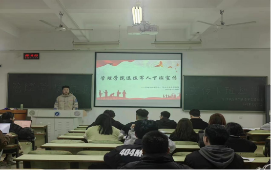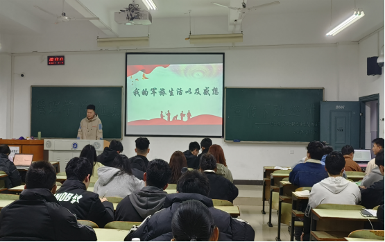 在下班宣讲中,退伍军人在各专业班级播放并组织大家学习了2023年征兵宣传片《从军行》,推动同学们响应号召、携笔从戎,也通过视频的核心内涵来激发同学们在生活中锻炼自己、提升自身体质,更希望同学们到军营里磨练意志、增长才干,为祖国国防建设添砖加瓦。