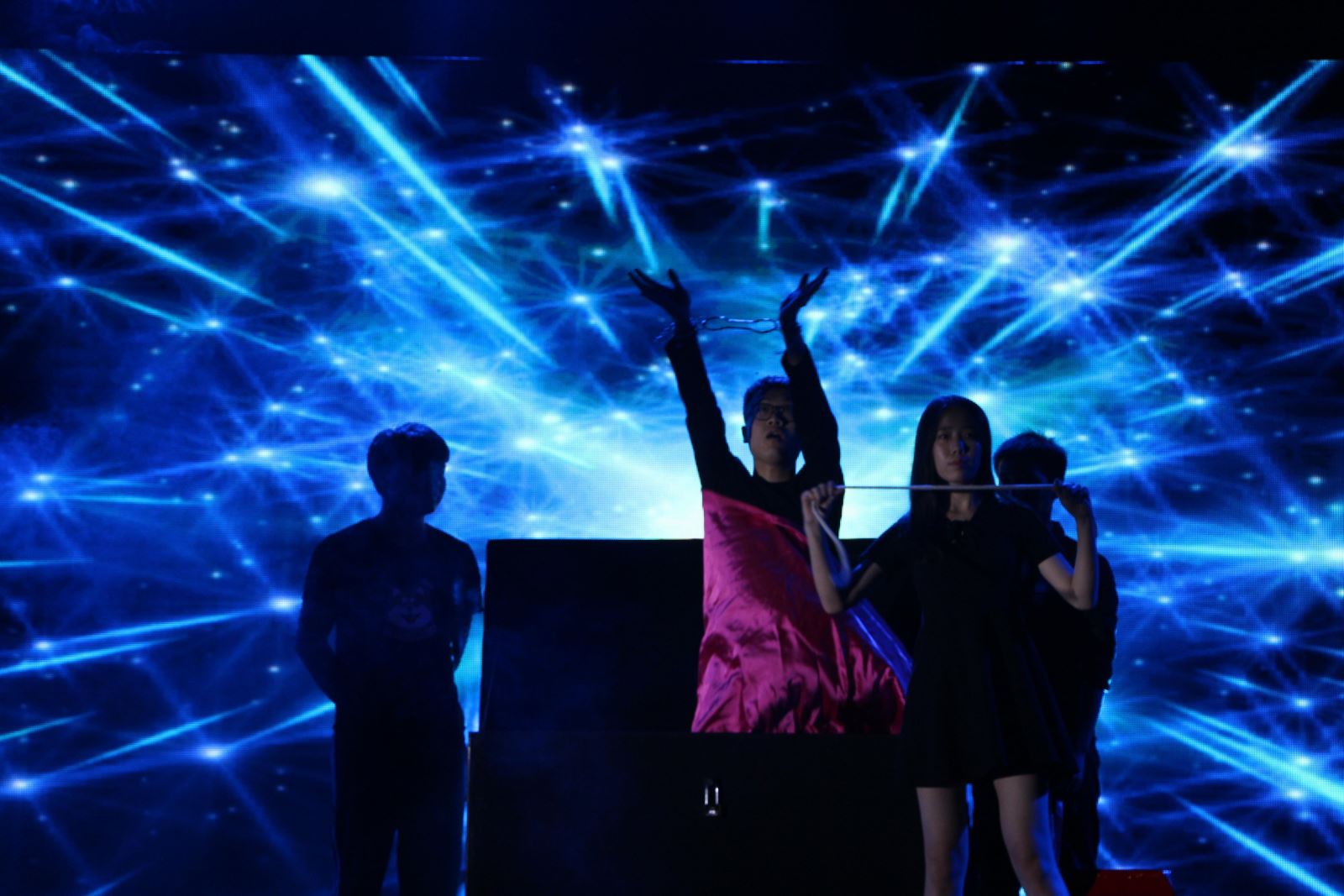 大四学生与大一学生合作带来的带来的魔术《Magic show》更是精彩绝伦,让我们见识了一场神秘变人魔术。