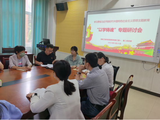 5月25日下午,管理学院党委在G505会议室举行主题教育“以学铸魂”专题学习研讨。学院党委书记余博主持学习,学院党委领导班子成员、教工支部书记、学生支部书记和部分支委参加学习。