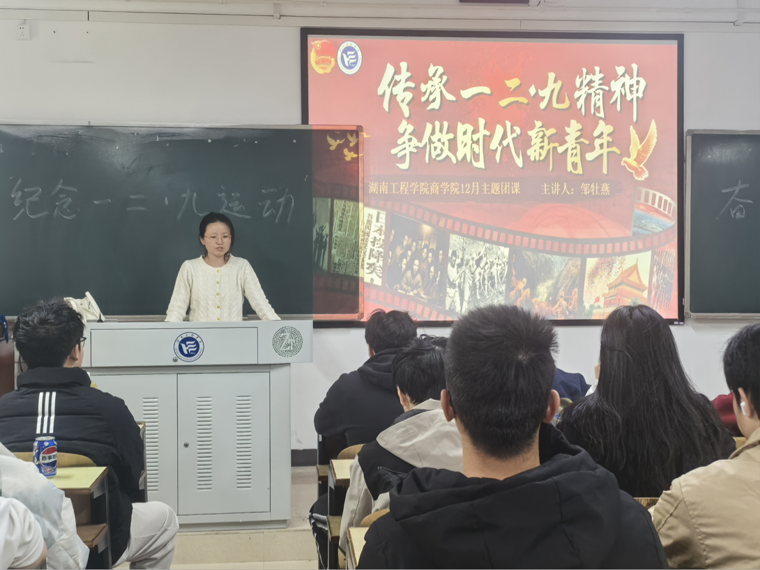 为传承爱国主义精神,激励青年学子勇担时代使命,欧美三级在线于2025年12月17日下午在主教学楼A202教室举办了“传承一二·九精神,争做时代新青年”主题团课,欧美三级在线团委书记邹牡燕老师为本次团课主讲人,国际经济与贸易2301、2302班全体学生共同参与。