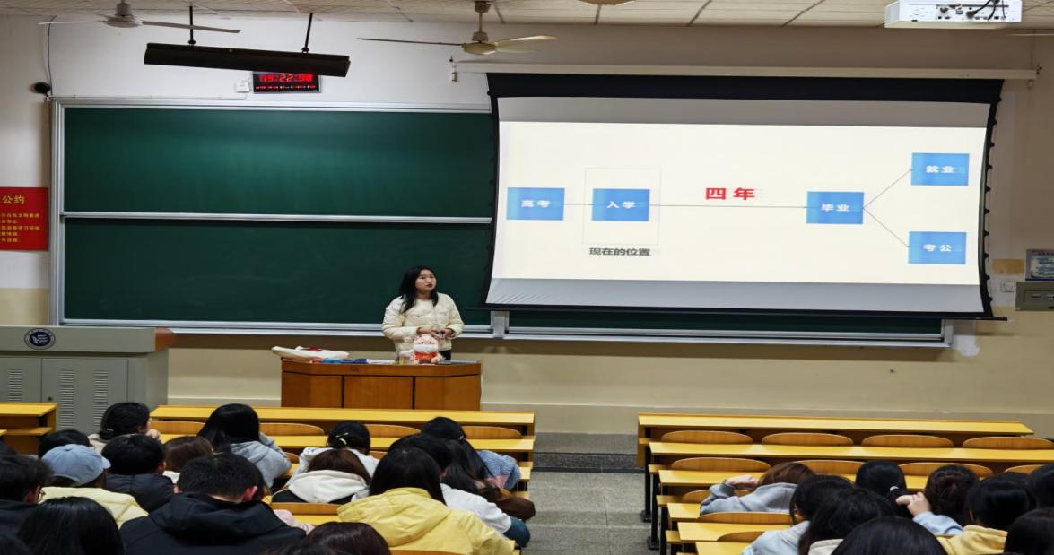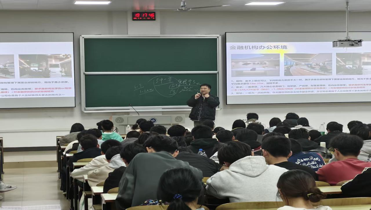讲座围绕“专业认知”与“学业规划”两大主题,首先对金融工程、国际经济与贸易、数字经济、会计学四个专业的核心课程体系、培养方向及学习重点进行了系统梳理,帮助新生从宏观上把握专业全貌。在学业规划指导环节,主讲老师针对新生普遍关心的“如何平衡课程学习与实践”“如何选择竞赛与科研方向”“如何规划升学与就业”等问题,给出了针对性建议。针对不同专业的特点,老师还给出了差异化规划建议:金融专业学生可重点参与模拟炒股、金融建模等竞赛;国贸专业学生可深耕跨境电商实训平台;数字经济专业学生可参与大数据分析项目;会计专业学生可提前接触财务共享中心实训。