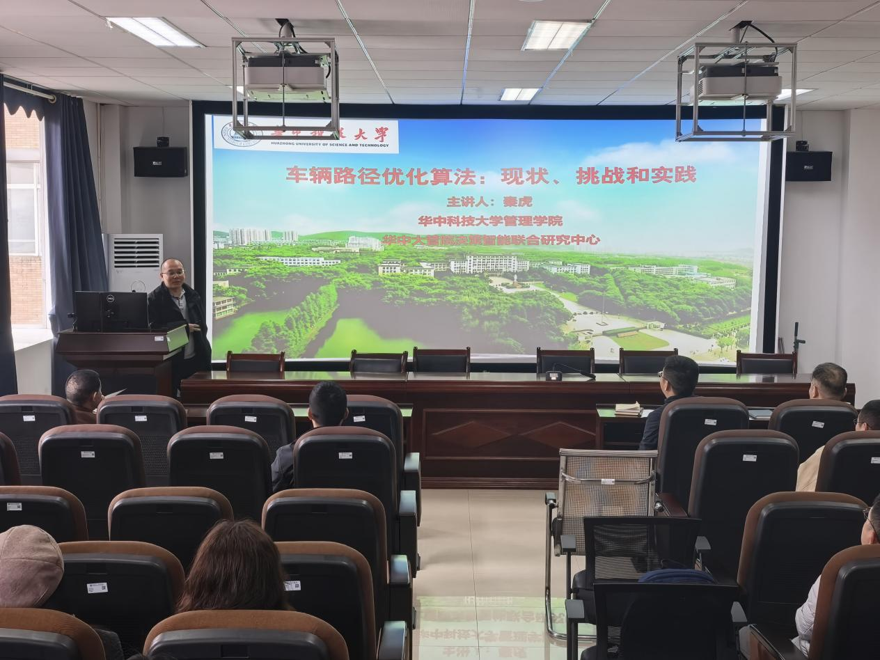 随后,秦虎教授作了题为“车辆路径优化算法:现状、挑战和实践”的学术报告。他结合自身在运筹优化与智能算法领域的深厚积累,系统梳理了车辆路径问题(VRP)从经典模型到现代启发式算法、机器学习融合方法的发展脉络。秦虎重点分析了当前算法在应对大规模、动态、实时约束等复杂场景时所面临的挑战,并展示了其团队在物流配送、城市交通等领域的实际应用案例,充分展现了算法优化在降本增效、推动企业数字化转型中的核心价值。