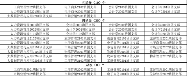 根据湖南工程学院校团委《“对标定级”工作指引》,经各班级团支部自评、学院团总支复核,评定工商管理2202班等10个团支部为五星级团支部,人力资源管理2001班等35个团支部为四星级团支部,工商管理2001班等8个团支部为三星团支部。现予以公示,具体结果如下: