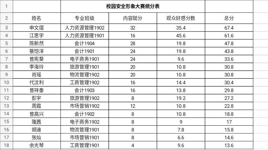 大赛后期,管理学院团总支学生联合会安全督察部的成员及观众对参赛人员作品进行了投票。以观众好感分数+内容赋分=综合分数来进行排名,依次可得相应票数。个人积分赛将采取一分一票的模式,观众分数占总票数的60%,内容赋分占总票数的40%。最终决出了此次大赛的冠亚季军(见下表),他们将作为校园的安全形象大使。同时其他参赛人员也表现优异,此次大赛圆满落幕。