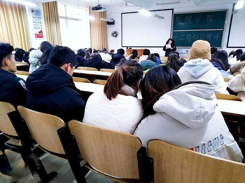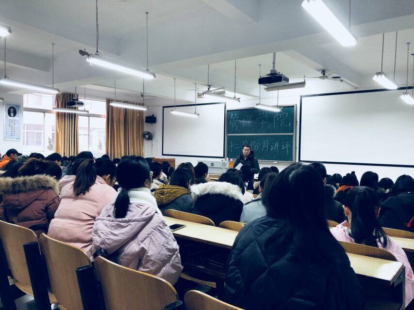 本月月评会具体内容如下:一、近期工作通报:1.学风建设:提高课堂的到课率和抬头率;2.备考英语四六级:报考了英语四、六级的同学认真备考;全院师生务必严格按相关规定和要求监考、参考。3. 表彰大会评选即将结束,各班班长需认真查看表彰人员评比细则,组织学生参与评比,并通知参评人员及时上交评比材料。4.教室、宿舍卫生:各班同学保持上课的教室干净整洁,如果出现大量垃圾、广告张贴或墙壁涂鸦,将在班长群公布;务必将垃圾带出宿舍楼,保持宿舍干净整洁;叮嘱同学们注意寝室用电安全;加强文明督导环节工作。二、其他工作汇报:“菜鸟”到“霸道总裁”的主题讲座顺利召开、“正泰杯”的报名工作宣传及准备。三、冬季安全系列教育及心理健康教育:1. 12月7日召开的女性健康知识讲座为女同学们提供了一个了解自己生理知识的机会;2. 12月7日召开的消防安全讲座,提高了同学们的消防安全意识。3.管理学院安全督查部对防火防盗等安全问题进行宣讲:提醒同学们防骗、禁大功率电器、防病御寒、外出需结伴而行,注意车辆、坚决抵制校园贷、积极举报代课;4.新校区校卫队将在近期完成管理学院所有专业的校园安全知识宣讲;5.心理咨询室预约。