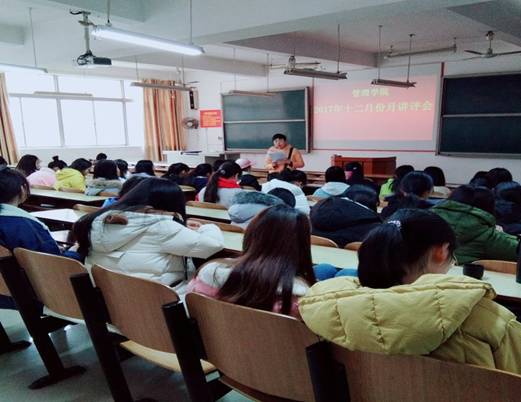 2017年12月12日中午12:10,管理学院大一大二双学号同学,大三班委,大四班长、学委、团支书,在主校区教室内进行本学期第四次月评会议。学办辅导老师罗荃、黎博、单艳艳、包海燕、周艺、宋志航对工商管理、旅游管理、人力资源管理、会计学、物流管理、市场营销六个专业进行讲评,本月心理会议也同月评会同一时间顺利展开。