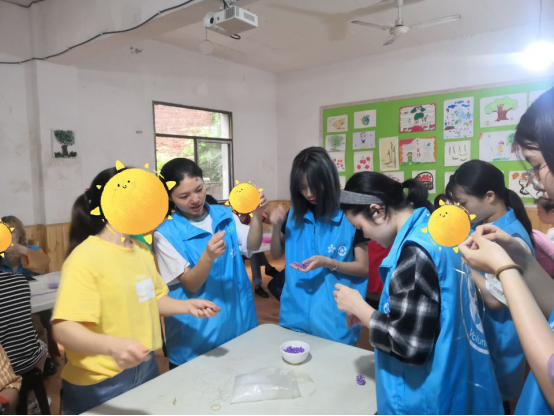 14点50分,志愿者在园长的带领下,来到室内和亲园的小伙伴们一起做手工。此次志愿活动主要以串珠的方式制作各种具有不同风格的手工艺术品。