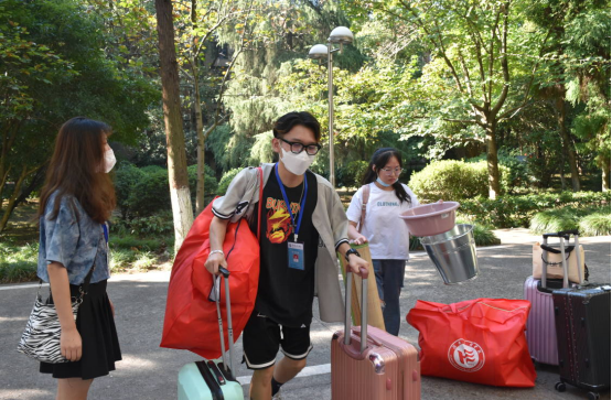 门口的工作者在岗位上尽职尽责,新来的同学也积极配合相关工作。由于疫情的原因,陪同的家长不能进入学校,望着自己满是行李的孩子在志愿者的帮助下进行报道,他们也多了一份安心。坚守在工作棚下的学生工作者们,耐心的回答新生的问题,即便工作非常忙碌,也尽心地引导他们完成报道工作。身负杂重行李的新生,在志愿者的帮助下,减少的不仅仅是身体上的负担,更是减少了第一次一个人进入大学的茫然与无措,感受到了管理学院大家庭的温暖。
