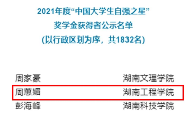 9月28日,共青团中央、全国学联公布了2021年度“中国大学生自强之星”奖学金获得者名单,湖南工程学院管理学院会计学2003班周蕙媚获此殊荣,展示出湖工学子热爱祖国、品行优良、不畏艰难、自强不息的青春风采。
