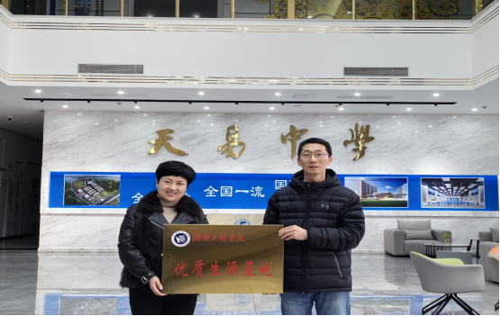 视频结束后,学校双方进行友好合作协议的签订。最后,我院党委副书记谭超代表湖南工程学院向湘潭县天易中学授“优质生源基地”牌,双方学校代表一起留影纪念。