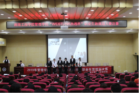 2019年5月13日晚七点半,2019年“WESTLINK西遇杯”管理学院职业生涯规划大赛复赛在湖南工程学院新校区教学主楼举行,复赛赛制为职业生涯规划展示与演说,选手们用4分钟并结合PPT、视频、配乐对自己的规划进行讲解。大一组选手们的职业生涯规划设计结构完整、逻辑清晰、条理清楚、详略得当、职业生涯目标制定贴切合理,演讲过程富有感染力。选手们展示完毕后,戴晶晶老师深入浅出地分析了每个学生的优缺点,指出比赛中选手存在的问题,同时她讲到:“同学们要树立职业规划意识、竞争意识和危机意识,明确自己的发展方向,充实自己的大学生活”。非大一组选手也是自信满满,其中林宇婕讲到“作为一个人力资源管理专业的人,成为HR更有优势,我会好好把握机会”。其余选手也从自我认知、职业环境分析、职业目标确定、评估与调整几个方面讲述了自己的职业生涯规划。展示结束后,三位评委从选手演讲、仪容仪表、PPT三个方面对选手们的职业生娃规划演讲进行了全面点评。段超群老师讲到“同学们自我评估比较全面,职业目标也相对清晰,但在规划中也有一些不足,希望同学们在规划的时候,要坚定信念,志存高远”。经过激烈比拼最终大一组晋级6人,非大一组晋级6人。