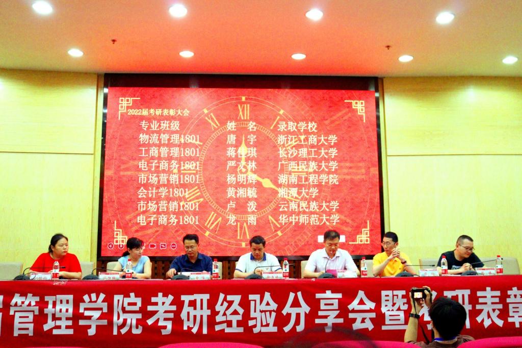 为表彰在2022年全国硕士研究生考试中取得优异成绩的管院学子,同时,为存在考研相关疑问的同学提供经验分享交流机会,6月10日19点至21点,湖南工程学院管理学院于新校区图书馆二报告厅成功举办了2022届管理学院考研经验分享会暨考研表彰大会。考研表彰大会由管理学院党委副书记谭超主持,到场领导包括管理学院院长徐运保,党委书记余博,副院长潘立军、张维梅,院办主任单艳艳,学办主任黎博,2022届管理学院考研优秀毕业生,管理学院大二、大三各班级代表参与会议。